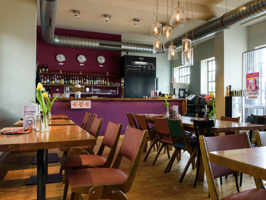 Kernstück unserer Räumlichkeiten, deren industrieller Charakter bei der Neugestaltung bewahrt wurde, ist das lichtdurchflutete Restaurant mit ca. 40 Plätzen, direkt daneben liegen der glasüberdachte Lichthof mit Platz für 60 bis 80 Personen und die Cantina Bar.